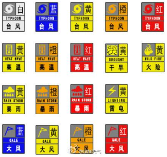 32.氣象災害預警信號:浙江省氣象災害預警信號分臺風、大風、暴雨、暴雪、寒潮、低溫、霜凍、道路結冰、冰雹、高溫、干旱、雷電、大霧、霾14類。根據氣象災害可能造成的危害程度、發生的緊急程度以及發展態勢,氣象災害預警信號一般劃分為四級:Ⅳ級(一般)、Ⅲ級(較重)、Ⅱ級(嚴重)、Ⅰ級(特別嚴重),分別用藍色、黃色、橙色、紅色中英文圖標標識。